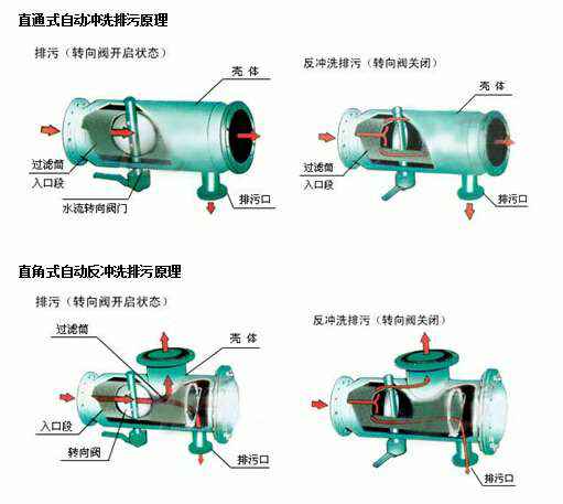 反冲洗时,水流转向阀为关闭状态,排污阀开启,这时水流被迫从过滤网筒的入口段网孔进入过滤筒外侧与壳体夹层,反向从网筒外侧冲洗粘附在网孔上的杂质,达到清洁过滤网的目的。由于转向阀关闭,水经过反冲阀后流带增大,反洗效果好。