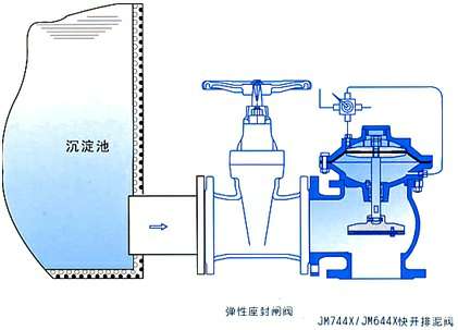JM744X、JM644X隔膜式液压、气动快开排泥阀,是一种由液压源或气动源作执行机构的角型截断类阀门通常成排安装在沉淀池底部外侧壁,用以排除池底沉淀的泥砂和污物。该阀由尼龙强化橡胶隔膜将阀门分为两个腔室,接通液压或气动源,采用电动或手动二位四通换向阀控制,实现快速排泥。该阀将隔膜代替活塞无运动摩擦,更适用于泥浆等颗粒介质,大大提高了阀门的使用寿命。